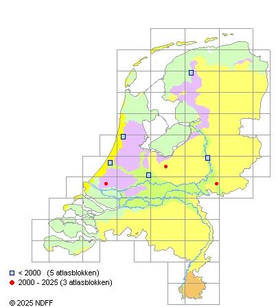 Het aantal atlasblokken (5x5 km) waarin de soort is gemeld binnen een periode van vijf jaar (vanaf 1980) of twintig jaar. Niet gecorrigeerd voor waarnemersinspanning en het aantal doorgegeven waarnemingen kan sterk variëren per periode, dus een trend in verspreiding kan hier niet direct uit worden afgelezen. Het opgegeven jaartal is het eerste jaar van de periode. Bron: gevalideerde waarnemingen uit de NDFF.