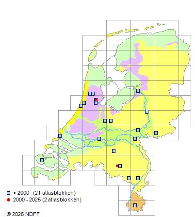 Het aantal atlasblokken (5x5 km) waarin de soort is gemeld binnen een periode van vijf jaar (vanaf 1980) of twintig jaar. Niet gecorrigeerd voor waarnemersinspanning en het aantal doorgegeven waarnemingen kan sterk variëren per periode, dus een trend in verspreiding kan hier niet direct uit worden afgelezen. Het opgegeven jaartal is het eerste jaar van de periode. Bron: gevalideerde waarnemingen uit de NDFF.