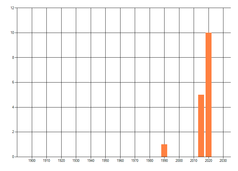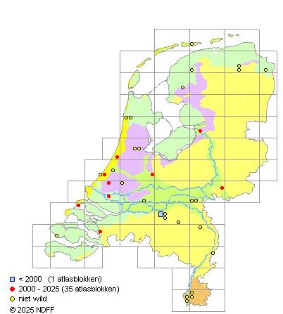 Het aantal atlasblokken (5x5 km) waarin de soort is gemeld binnen een periode van vijf jaar (vanaf 1980) of twintig jaar. Niet gecorrigeerd voor waarnemersinspanning en het aantal doorgegeven waarnemingen kan sterk variëren per periode, dus een trend in verspreiding kan hier niet direct uit worden afgelezen. Het opgegeven jaartal is het eerste jaar van de periode. Bron: gevalideerde waarnemingen uit de NDFF.