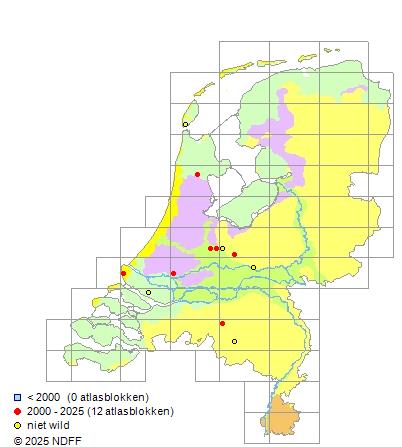 Het aantal atlasblokken (5x5 km) waarin de soort is gemeld binnen een periode van vijf jaar (vanaf 1980) of twintig jaar. Niet gecorrigeerd voor waarnemersinspanning en het aantal doorgegeven waarnemingen kan sterk variëren per periode, dus een trend in verspreiding kan hier niet direct uit worden afgelezen. Het opgegeven jaartal is het eerste jaar van de periode. Bron: gevalideerde waarnemingen uit de NDFF.