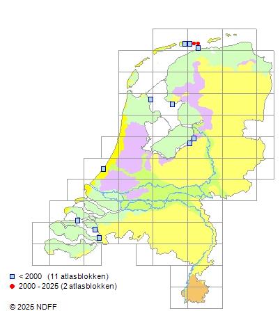 Het aantal atlasblokken (5x5 km) waarin de soort is gemeld binnen een periode van vijf jaar (vanaf 1980) of twintig jaar. Niet gecorrigeerd voor waarnemersinspanning en het aantal doorgegeven waarnemingen kan sterk variëren per periode, dus een trend in verspreiding kan hier niet direct uit worden afgelezen. Het opgegeven jaartal is het eerste jaar van de periode. Bron: gevalideerde waarnemingen uit de NDFF.