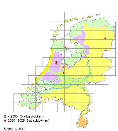 Het aantal atlasblokken (5x5 km) waarin de soort is gemeld binnen een periode van vijf jaar (vanaf 1980) of twintig jaar. Niet gecorrigeerd voor waarnemersinspanning en het aantal doorgegeven waarnemingen kan sterk variëren per periode, dus een trend in verspreiding kan hier niet direct uit worden afgelezen. Het opgegeven jaartal is het eerste jaar van de periode. Bron: gevalideerde waarnemingen uit de NDFF.