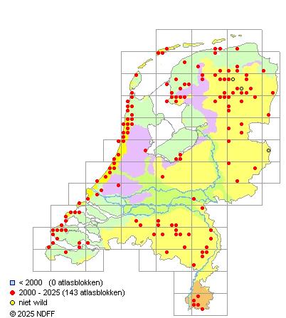 Het aantal atlasblokken (5x5 km) waarin de soort is gemeld binnen een periode van vijf jaar (vanaf 1980) of twintig jaar. Niet gecorrigeerd voor waarnemersinspanning en het aantal doorgegeven waarnemingen kan sterk variëren per periode, dus een trend in verspreiding kan hier niet direct uit worden afgelezen. Het opgegeven jaartal is het eerste jaar van de periode. Bron: gevalideerde waarnemingen uit de NDFF.