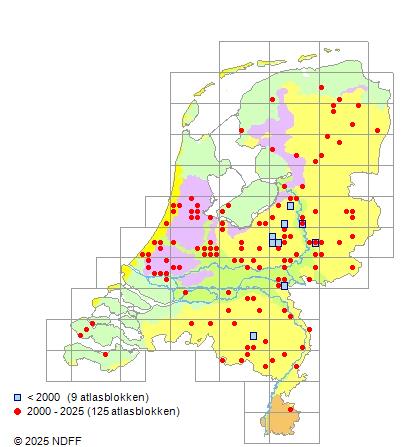 Het aantal atlasblokken (5x5 km) waarin de soort is gemeld binnen een periode van vijf jaar (vanaf 1980) of twintig jaar. Niet gecorrigeerd voor waarnemersinspanning en het aantal doorgegeven waarnemingen kan sterk variëren per periode, dus een trend in verspreiding kan hier niet direct uit worden afgelezen. Het opgegeven jaartal is het eerste jaar van de periode. Bron: gevalideerde waarnemingen uit de NDFF.