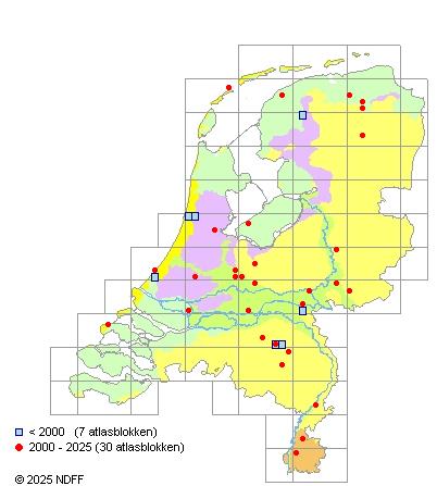 Het aantal atlasblokken (5x5 km) waarin de soort is gemeld binnen een periode van vijf jaar (vanaf 1980) of twintig jaar. Niet gecorrigeerd voor waarnemersinspanning en het aantal doorgegeven waarnemingen kan sterk variëren per periode, dus een trend in verspreiding kan hier niet direct uit worden afgelezen. Het opgegeven jaartal is het eerste jaar van de periode. Bron: gevalideerde waarnemingen uit de NDFF.