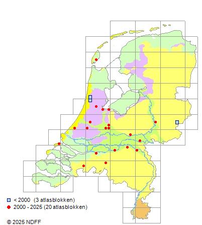 Het aantal atlasblokken (5x5 km) waarin de soort is gemeld binnen een periode van vijf jaar (vanaf 1980) of twintig jaar. Niet gecorrigeerd voor waarnemersinspanning en het aantal doorgegeven waarnemingen kan sterk variëren per periode, dus een trend in verspreiding kan hier niet direct uit worden afgelezen. Het opgegeven jaartal is het eerste jaar van de periode. Bron: gevalideerde waarnemingen uit de NDFF.