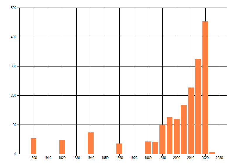 Het aantal atlasblokken (5x5 km) waarin de soort is gemeld binnen een periode van vijf jaar (vanaf 1980) of twintig jaar. Niet gecorrigeerd voor waarnemersinspanning en het aantal doorgegeven waarnemingen kan sterk variëren per periode, dus een trend in verspreiding kan hier niet direct uit worden afgelezen. Het opgegeven jaartal is het eerste jaar van de periode. Bron: gevalideerde waarnemingen uit de NDFF.
