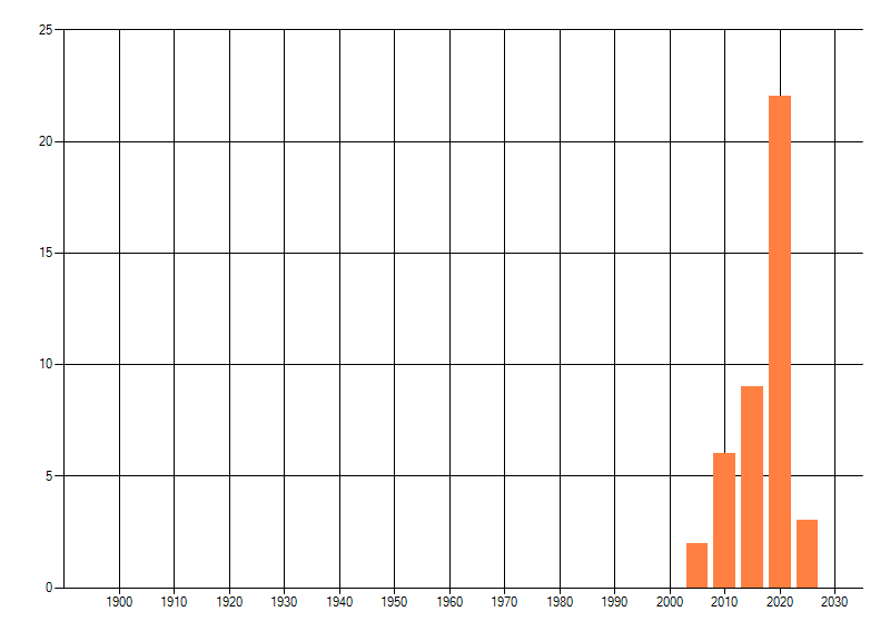 Het aantal atlasblokken (5x5 km) waarin de soort is gemeld binnen een periode van vijf jaar (vanaf 1980) of twintig jaar. Niet gecorrigeerd voor waarnemersinspanning en het aantal doorgegeven waarnemingen kan sterk variëren per periode, dus een trend in verspreiding kan hier niet direct uit worden afgelezen. Het opgegeven jaartal is het eerste jaar van de periode. Bron: gevalideerde waarnemingen uit de NDFF.