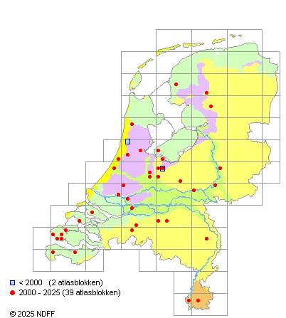 Het aantal atlasblokken (5x5 km) waarin de soort is gemeld binnen een periode van vijf jaar (vanaf 1980) of twintig jaar. Niet gecorrigeerd voor waarnemersinspanning en het aantal doorgegeven waarnemingen kan sterk variëren per periode, dus een trend in verspreiding kan hier niet direct uit worden afgelezen. Het opgegeven jaartal is het eerste jaar van de periode. Bron: gevalideerde waarnemingen uit de NDFF.