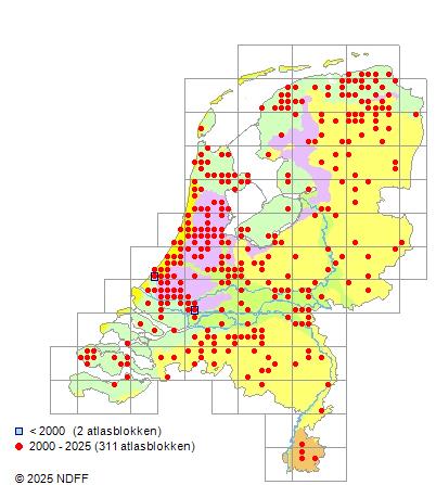 Het aantal atlasblokken (5x5 km) waarin de soort is gemeld binnen een periode van vijf jaar (vanaf 1980) of twintig jaar. Niet gecorrigeerd voor waarnemersinspanning en het aantal doorgegeven waarnemingen kan sterk variëren per periode, dus een trend in verspreiding kan hier niet direct uit worden afgelezen. Het opgegeven jaartal is het eerste jaar van de periode. Bron: gevalideerde waarnemingen uit de NDFF.