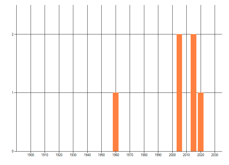 Het aantal atlasblokken (5x5 km) waarin de soort is gemeld binnen een periode van vijf jaar (vanaf 1980) of twintig jaar. Niet gecorrigeerd voor waarnemersinspanning en het aantal doorgegeven waarnemingen kan sterk variëren per periode, dus een trend in verspreiding kan hier niet direct uit worden afgelezen. Het opgegeven jaartal is het eerste jaar van de periode. Bron: gevalideerde waarnemingen uit de NDFF.