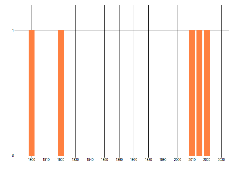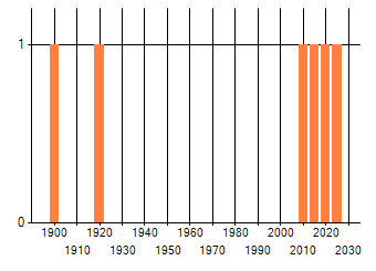 Het aantal atlasblokken (5x5 km) waarin de soort is gemeld binnen een periode van vijf jaar (vanaf 1980) of twintig jaar. Niet gecorrigeerd voor waarnemersinspanning en het aantal doorgegeven waarnemingen kan sterk variëren per periode, dus een trend in verspreiding kan hier niet direct uit worden afgelezen. Het opgegeven jaartal is het eerste jaar van de periode. Bron: gevalideerde waarnemingen uit de NDFF.
