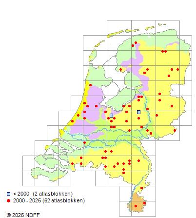 Het aantal atlasblokken (5x5 km) waarin de soort is gemeld binnen een periode van vijf jaar (vanaf 1980) of twintig jaar. Niet gecorrigeerd voor waarnemersinspanning en het aantal doorgegeven waarnemingen kan sterk variëren per periode, dus een trend in verspreiding kan hier niet direct uit worden afgelezen. Het opgegeven jaartal is het eerste jaar van de periode. Bron: gevalideerde waarnemingen uit de NDFF.
