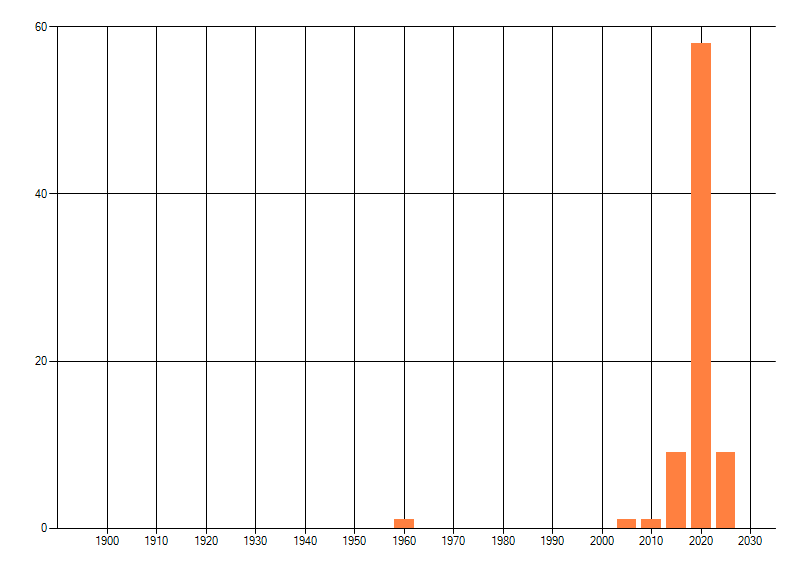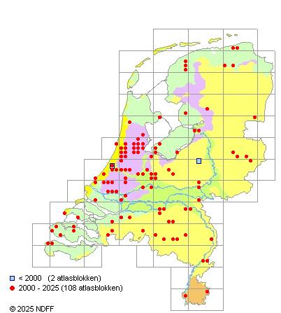 Het aantal atlasblokken (5x5 km) waarin de soort is gemeld binnen een periode van vijf jaar (vanaf 1980) of twintig jaar. Niet gecorrigeerd voor waarnemersinspanning en het aantal doorgegeven waarnemingen kan sterk variëren per periode, dus een trend in verspreiding kan hier niet direct uit worden afgelezen. Het opgegeven jaartal is het eerste jaar van de periode. Bron: gevalideerde waarnemingen uit de NDFF.