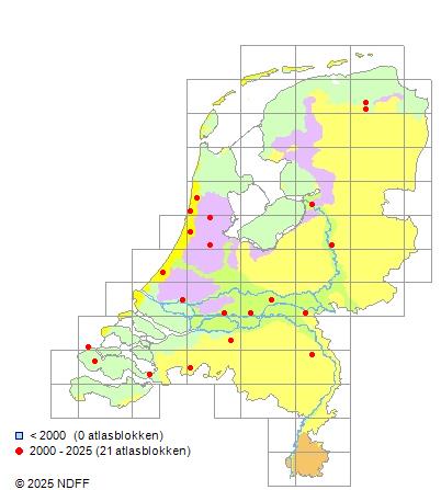Het aantal atlasblokken (5x5 km) waarin de soort is gemeld binnen een periode van vijf jaar (vanaf 1980) of twintig jaar. Niet gecorrigeerd voor waarnemersinspanning en het aantal doorgegeven waarnemingen kan sterk variëren per periode, dus een trend in verspreiding kan hier niet direct uit worden afgelezen. Het opgegeven jaartal is het eerste jaar van de periode. Bron: gevalideerde waarnemingen uit de NDFF.