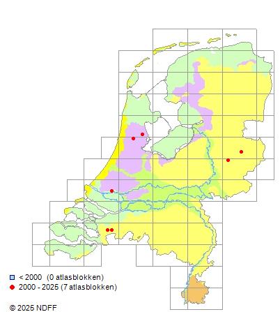 Het aantal atlasblokken (5x5 km) waarin de soort is gemeld binnen een periode van vijf jaar (vanaf 1980) of twintig jaar. Niet gecorrigeerd voor waarnemersinspanning en het aantal doorgegeven waarnemingen kan sterk variëren per periode, dus een trend in verspreiding kan hier niet direct uit worden afgelezen. Het opgegeven jaartal is het eerste jaar van de periode. Bron: gevalideerde waarnemingen uit de NDFF.