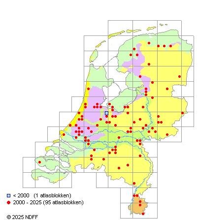 Het aantal atlasblokken (5x5 km) waarin de soort is gemeld binnen een periode van vijf jaar (vanaf 1980) of twintig jaar. Niet gecorrigeerd voor waarnemersinspanning en het aantal doorgegeven waarnemingen kan sterk variëren per periode, dus een trend in verspreiding kan hier niet direct uit worden afgelezen. Het opgegeven jaartal is het eerste jaar van de periode. Bron: gevalideerde waarnemingen uit de NDFF.