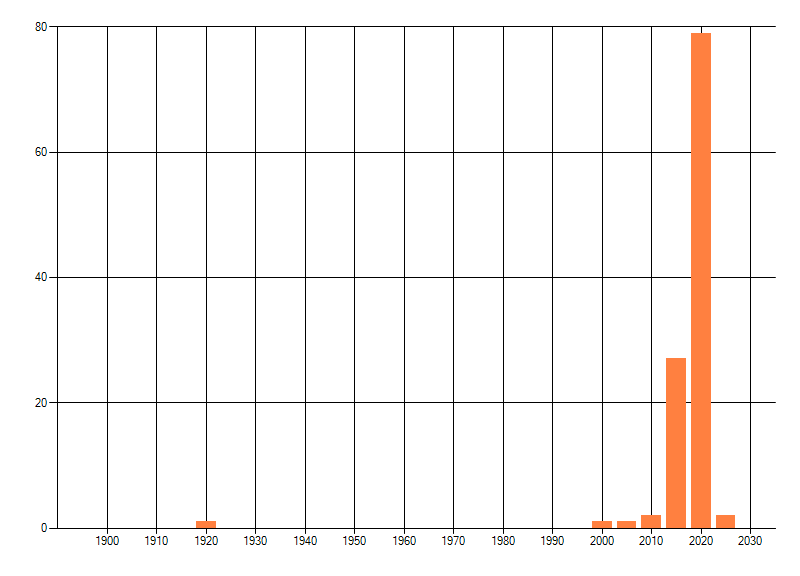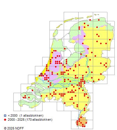 Het aantal atlasblokken (5x5 km) waarin de soort is gemeld binnen een periode van vijf jaar (vanaf 1980) of twintig jaar. Niet gecorrigeerd voor waarnemersinspanning en het aantal doorgegeven waarnemingen kan sterk variëren per periode, dus een trend in verspreiding kan hier niet direct uit worden afgelezen. Het opgegeven jaartal is het eerste jaar van de periode. Bron: gevalideerde waarnemingen uit de NDFF.