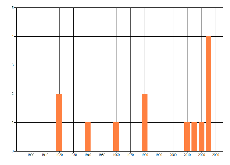 Het aantal atlasblokken (5x5 km) waarin de soort is gemeld binnen een periode van vijf jaar (vanaf 1980) of twintig jaar. Niet gecorrigeerd voor waarnemersinspanning en het aantal doorgegeven waarnemingen kan sterk variëren per periode, dus een trend in verspreiding kan hier niet direct uit worden afgelezen. Het opgegeven jaartal is het eerste jaar van de periode. Bron: gevalideerde waarnemingen uit de NDFF.