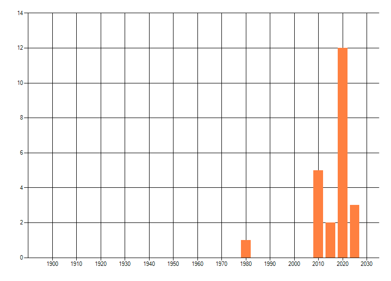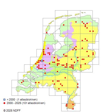 Het aantal atlasblokken (5x5 km) waarin de soort is gemeld binnen een periode van vijf jaar (vanaf 1980) of twintig jaar. Niet gecorrigeerd voor waarnemersinspanning en het aantal doorgegeven waarnemingen kan sterk variëren per periode, dus een trend in verspreiding kan hier niet direct uit worden afgelezen. Het opgegeven jaartal is het eerste jaar van de periode. Bron: gevalideerde waarnemingen uit de NDFF.