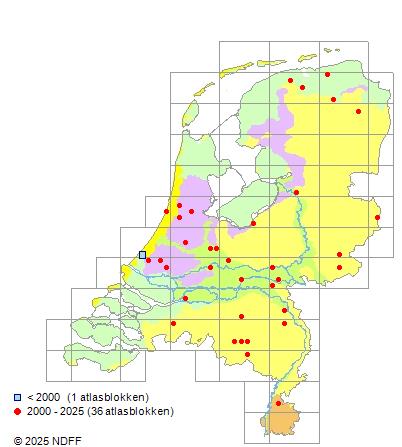 Het aantal atlasblokken (5x5 km) waarin de soort is gemeld binnen een periode van vijf jaar (vanaf 1980) of twintig jaar. Niet gecorrigeerd voor waarnemersinspanning en het aantal doorgegeven waarnemingen kan sterk variëren per periode, dus een trend in verspreiding kan hier niet direct uit worden afgelezen. Het opgegeven jaartal is het eerste jaar van de periode. Bron: gevalideerde waarnemingen uit de NDFF.