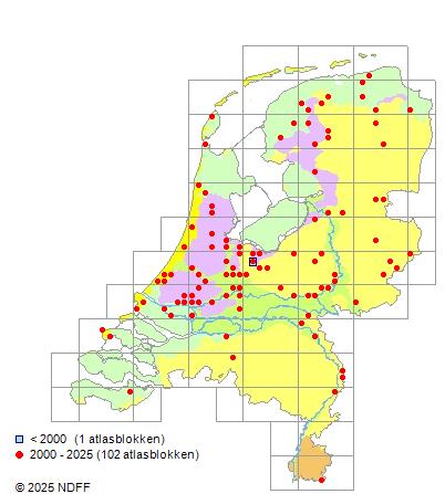Het aantal atlasblokken (5x5 km) waarin de soort is gemeld binnen een periode van vijf jaar (vanaf 1980) of twintig jaar. Niet gecorrigeerd voor waarnemersinspanning en het aantal doorgegeven waarnemingen kan sterk variëren per periode, dus een trend in verspreiding kan hier niet direct uit worden afgelezen. Het opgegeven jaartal is het eerste jaar van de periode. Bron: gevalideerde waarnemingen uit de NDFF.