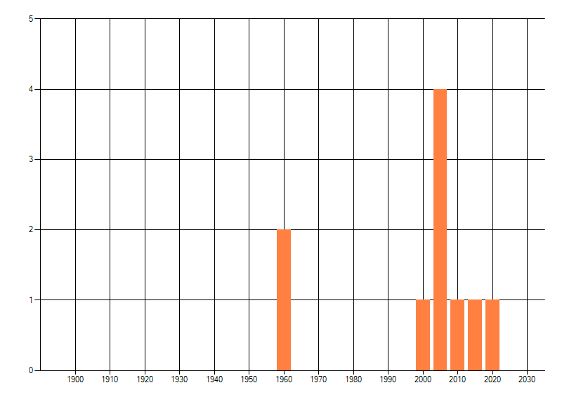 Het aantal atlasblokken (5x5 km) waarin de soort is gemeld binnen een periode van vijf jaar (vanaf 1980) of twintig jaar. Niet gecorrigeerd voor waarnemersinspanning en het aantal doorgegeven waarnemingen kan sterk variëren per periode, dus een trend in verspreiding kan hier niet direct uit worden afgelezen. Het opgegeven jaartal is het eerste jaar van de periode. Bron: gevalideerde waarnemingen uit de NDFF.