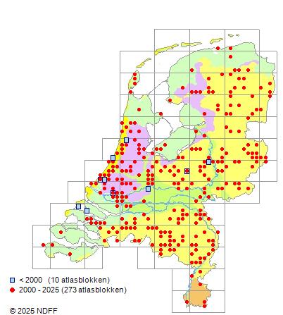 Het aantal atlasblokken (5x5 km) waarin de soort is gemeld binnen een periode van vijf jaar (vanaf 1980) of twintig jaar. Niet gecorrigeerd voor waarnemersinspanning en het aantal doorgegeven waarnemingen kan sterk variëren per periode, dus een trend in verspreiding kan hier niet direct uit worden afgelezen. Het opgegeven jaartal is het eerste jaar van de periode. Bron: gevalideerde waarnemingen uit de NDFF.