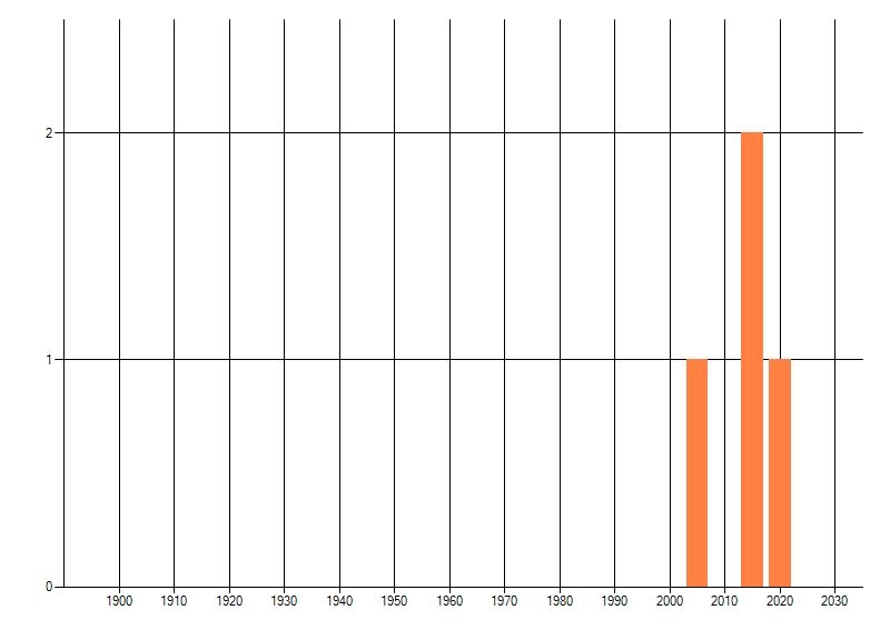 Het aantal atlasblokken (5x5 km) waarin de soort is gemeld binnen een periode van vijf jaar (vanaf 1980) of twintig jaar. Niet gecorrigeerd voor waarnemersinspanning en het aantal doorgegeven waarnemingen kan sterk variëren per periode, dus een trend in verspreiding kan hier niet direct uit worden afgelezen. Het opgegeven jaartal is het eerste jaar van de periode. Bron: gevalideerde waarnemingen uit de NDFF.