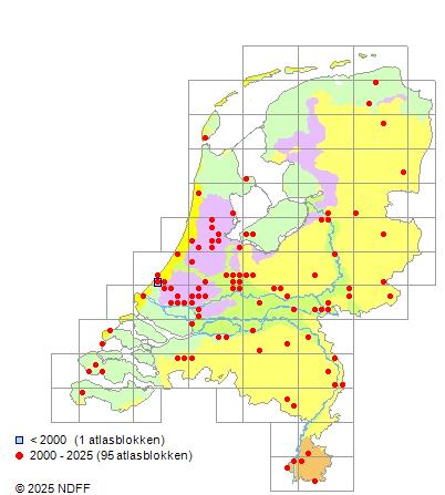 Het aantal atlasblokken (5x5 km) waarin de soort is gemeld binnen een periode van vijf jaar (vanaf 1980) of twintig jaar. Niet gecorrigeerd voor waarnemersinspanning en het aantal doorgegeven waarnemingen kan sterk variëren per periode, dus een trend in verspreiding kan hier niet direct uit worden afgelezen. Het opgegeven jaartal is het eerste jaar van de periode. Bron: gevalideerde waarnemingen uit de NDFF.