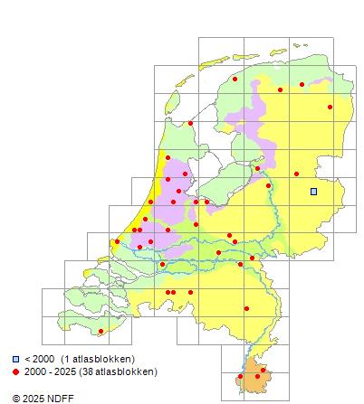 Het aantal atlasblokken (5x5 km) waarin de soort is gemeld binnen een periode van vijf jaar (vanaf 1980) of twintig jaar. Niet gecorrigeerd voor waarnemersinspanning en het aantal doorgegeven waarnemingen kan sterk variëren per periode, dus een trend in verspreiding kan hier niet direct uit worden afgelezen. Het opgegeven jaartal is het eerste jaar van de periode. Bron: gevalideerde waarnemingen uit de NDFF.