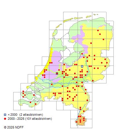 Het aantal atlasblokken (5x5 km) waarin de soort is gemeld binnen een periode van vijf jaar (vanaf 1980) of twintig jaar. Niet gecorrigeerd voor waarnemersinspanning en het aantal doorgegeven waarnemingen kan sterk variëren per periode, dus een trend in verspreiding kan hier niet direct uit worden afgelezen. Het opgegeven jaartal is het eerste jaar van de periode. Bron: gevalideerde waarnemingen uit de NDFF.