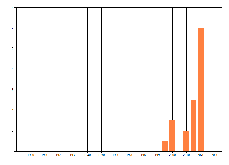 Het aantal atlasblokken (5x5 km) waarin de soort is gemeld binnen een periode van vijf jaar (vanaf 1980) of twintig jaar. Niet gecorrigeerd voor waarnemersinspanning en het aantal doorgegeven waarnemingen kan sterk variëren per periode, dus een trend in verspreiding kan hier niet direct uit worden afgelezen. Het opgegeven jaartal is het eerste jaar van de periode. Bron: gevalideerde waarnemingen uit de NDFF.