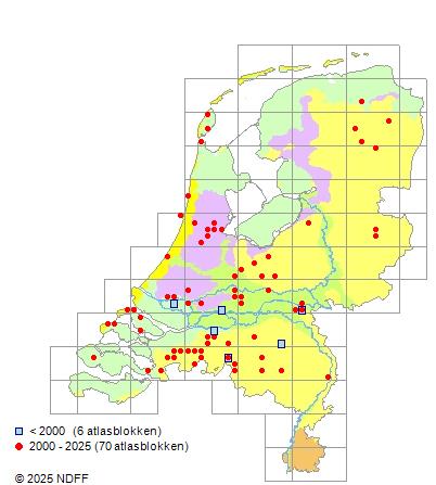 Het aantal atlasblokken (5x5 km) waarin de soort is gemeld binnen een periode van vijf jaar (vanaf 1980) of twintig jaar. Niet gecorrigeerd voor waarnemersinspanning en het aantal doorgegeven waarnemingen kan sterk variëren per periode, dus een trend in verspreiding kan hier niet direct uit worden afgelezen. Het opgegeven jaartal is het eerste jaar van de periode. Bron: gevalideerde waarnemingen uit de NDFF.