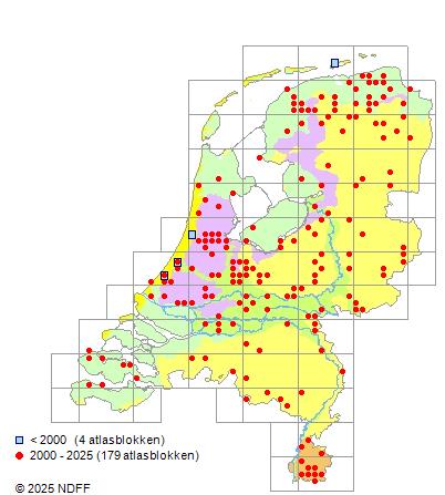 Het aantal atlasblokken (5x5 km) waarin de soort is gemeld binnen een periode van vijf jaar (vanaf 1980) of twintig jaar. Niet gecorrigeerd voor waarnemersinspanning en het aantal doorgegeven waarnemingen kan sterk variëren per periode, dus een trend in verspreiding kan hier niet direct uit worden afgelezen. Het opgegeven jaartal is het eerste jaar van de periode. Bron: gevalideerde waarnemingen uit de NDFF.