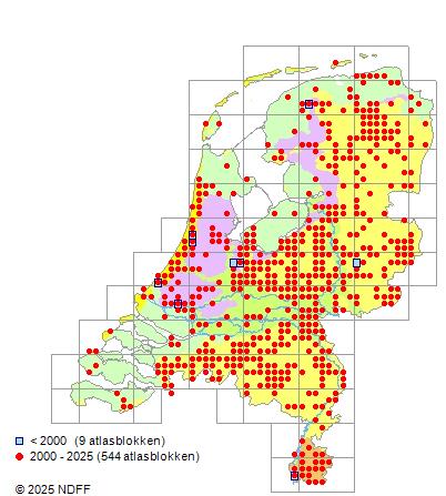 Het aantal atlasblokken (5x5 km) waarin de soort is gemeld binnen een periode van vijf jaar (vanaf 1980) of twintig jaar. Niet gecorrigeerd voor waarnemersinspanning en het aantal doorgegeven waarnemingen kan sterk variëren per periode, dus een trend in verspreiding kan hier niet direct uit worden afgelezen. Het opgegeven jaartal is het eerste jaar van de periode. Bron: gevalideerde waarnemingen uit de NDFF.