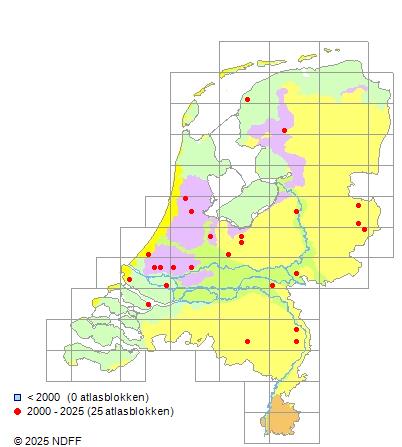 Het aantal atlasblokken (5x5 km) waarin de soort is gemeld binnen een periode van vijf jaar (vanaf 1980) of twintig jaar. Niet gecorrigeerd voor waarnemersinspanning en het aantal doorgegeven waarnemingen kan sterk variëren per periode, dus een trend in verspreiding kan hier niet direct uit worden afgelezen. Het opgegeven jaartal is het eerste jaar van de periode. Bron: gevalideerde waarnemingen uit de NDFF.