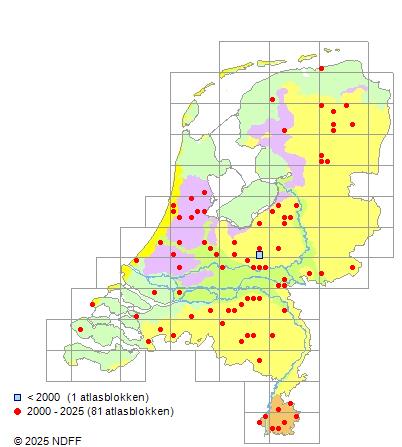Het aantal atlasblokken (5x5 km) waarin de soort is gemeld binnen een periode van vijf jaar (vanaf 1980) of twintig jaar. Niet gecorrigeerd voor waarnemersinspanning en het aantal doorgegeven waarnemingen kan sterk variëren per periode, dus een trend in verspreiding kan hier niet direct uit worden afgelezen. Het opgegeven jaartal is het eerste jaar van de periode. Bron: gevalideerde waarnemingen uit de NDFF.