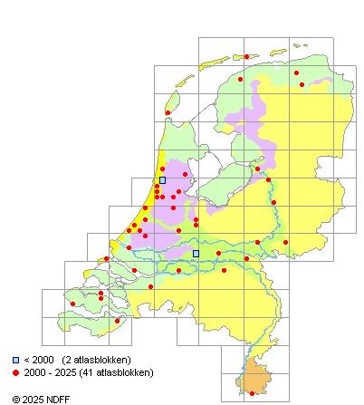 Het aantal atlasblokken (5x5 km) waarin de soort is gemeld binnen een periode van vijf jaar (vanaf 1980) of twintig jaar. Niet gecorrigeerd voor waarnemersinspanning en het aantal doorgegeven waarnemingen kan sterk variëren per periode, dus een trend in verspreiding kan hier niet direct uit worden afgelezen. Het opgegeven jaartal is het eerste jaar van de periode. Bron: gevalideerde waarnemingen uit de NDFF.