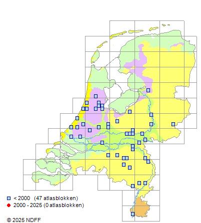 Het aantal atlasblokken (5x5 km) waarin de soort is gemeld binnen een periode van vijf jaar (vanaf 1980) of twintig jaar. Niet gecorrigeerd voor waarnemersinspanning en het aantal doorgegeven waarnemingen kan sterk variëren per periode, dus een trend in verspreiding kan hier niet direct uit worden afgelezen. Het opgegeven jaartal is het eerste jaar van de periode. Bron: gevalideerde waarnemingen uit de NDFF.