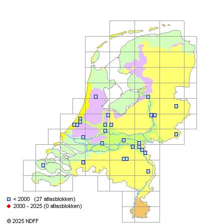 Het aantal atlasblokken (5x5 km) waarin de soort is gemeld binnen een periode van vijf jaar (vanaf 1980) of twintig jaar. Niet gecorrigeerd voor waarnemersinspanning en het aantal doorgegeven waarnemingen kan sterk variëren per periode, dus een trend in verspreiding kan hier niet direct uit worden afgelezen. Het opgegeven jaartal is het eerste jaar van de periode. Bron: gevalideerde waarnemingen uit de NDFF.