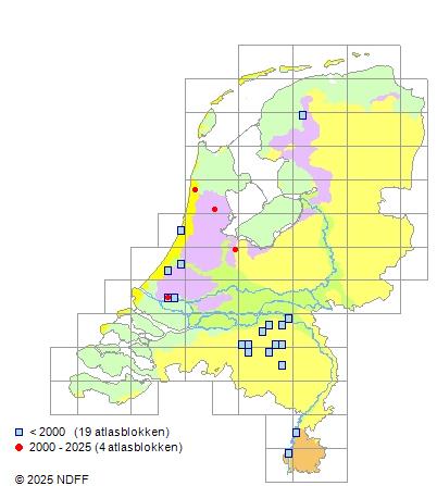 Het aantal atlasblokken (5x5 km) waarin de soort is gemeld binnen een periode van vijf jaar (vanaf 1980) of twintig jaar. Niet gecorrigeerd voor waarnemersinspanning en het aantal doorgegeven waarnemingen kan sterk variëren per periode, dus een trend in verspreiding kan hier niet direct uit worden afgelezen. Het opgegeven jaartal is het eerste jaar van de periode. Bron: gevalideerde waarnemingen uit de NDFF.