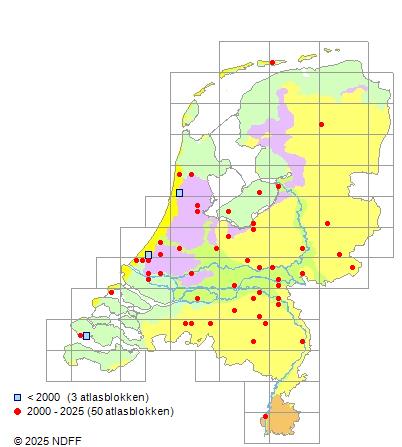 Het aantal atlasblokken (5x5 km) waarin de soort is gemeld binnen een periode van vijf jaar (vanaf 1980) of twintig jaar. Niet gecorrigeerd voor waarnemersinspanning en het aantal doorgegeven waarnemingen kan sterk variëren per periode, dus een trend in verspreiding kan hier niet direct uit worden afgelezen. Het opgegeven jaartal is het eerste jaar van de periode. Bron: gevalideerde waarnemingen uit de NDFF.