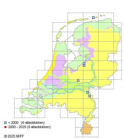 Het aantal atlasblokken (5x5 km) waarin de soort is gemeld binnen een periode van vijf jaar (vanaf 1980) of twintig jaar. Niet gecorrigeerd voor waarnemersinspanning en het aantal doorgegeven waarnemingen kan sterk variëren per periode, dus een trend in verspreiding kan hier niet direct uit worden afgelezen. Het opgegeven jaartal is het eerste jaar van de periode. Bron: gevalideerde waarnemingen uit de NDFF.