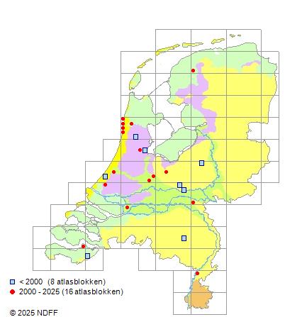 Het aantal atlasblokken (5x5 km) waarin de soort is gemeld binnen een periode van vijf jaar (vanaf 1980) of twintig jaar. Niet gecorrigeerd voor waarnemersinspanning en het aantal doorgegeven waarnemingen kan sterk variëren per periode, dus een trend in verspreiding kan hier niet direct uit worden afgelezen. Het opgegeven jaartal is het eerste jaar van de periode. Bron: gevalideerde waarnemingen uit de NDFF.