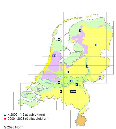 Het aantal atlasblokken (5x5 km) waarin de soort is gemeld binnen een periode van vijf jaar (vanaf 1980) of twintig jaar. Niet gecorrigeerd voor waarnemersinspanning en het aantal doorgegeven waarnemingen kan sterk variëren per periode, dus een trend in verspreiding kan hier niet direct uit worden afgelezen. Het opgegeven jaartal is het eerste jaar van de periode. Bron: gevalideerde waarnemingen uit de NDFF.