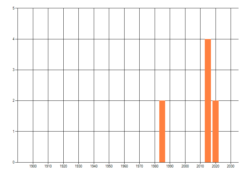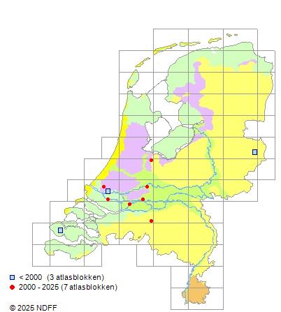 Het aantal atlasblokken (5x5 km) waarin de soort is gemeld binnen een periode van vijf jaar (vanaf 1980) of twintig jaar. Niet gecorrigeerd voor waarnemersinspanning en het aantal doorgegeven waarnemingen kan sterk variëren per periode, dus een trend in verspreiding kan hier niet direct uit worden afgelezen. Het opgegeven jaartal is het eerste jaar van de periode. Bron: gevalideerde waarnemingen uit de NDFF.
