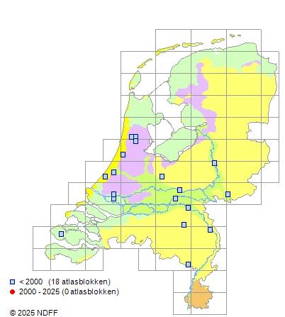 Het aantal atlasblokken (5x5 km) waarin de soort is gemeld binnen een periode van vijf jaar (vanaf 1980) of twintig jaar. Niet gecorrigeerd voor waarnemersinspanning en het aantal doorgegeven waarnemingen kan sterk variëren per periode, dus een trend in verspreiding kan hier niet direct uit worden afgelezen. Het opgegeven jaartal is het eerste jaar van de periode. Bron: gevalideerde waarnemingen uit de NDFF.