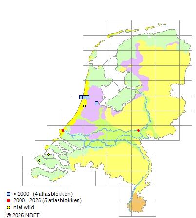 Het aantal atlasblokken (5x5 km) waarin de soort is gemeld binnen een periode van vijf jaar (vanaf 1980) of twintig jaar. Niet gecorrigeerd voor waarnemersinspanning en het aantal doorgegeven waarnemingen kan sterk variëren per periode, dus een trend in verspreiding kan hier niet direct uit worden afgelezen. Het opgegeven jaartal is het eerste jaar van de periode. Bron: gevalideerde waarnemingen uit de NDFF.