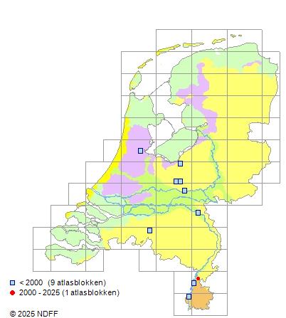 Het aantal atlasblokken (5x5 km) waarin de soort is gemeld binnen een periode van vijf jaar (vanaf 1980) of twintig jaar. Niet gecorrigeerd voor waarnemersinspanning en het aantal doorgegeven waarnemingen kan sterk variëren per periode, dus een trend in verspreiding kan hier niet direct uit worden afgelezen. Het opgegeven jaartal is het eerste jaar van de periode. Bron: gevalideerde waarnemingen uit de NDFF.